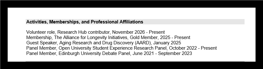 The placement of optional sections can vary depending on the section in question. In this case the optional sections covered here consist of Activities, Memberships (also sometimes titled as professional memberships), and Professional Affiliations. Regardless of whether you have elected to list these under one section, or have listed them each under separate headings, the guidance is to place this in the following area on a C.V or resume