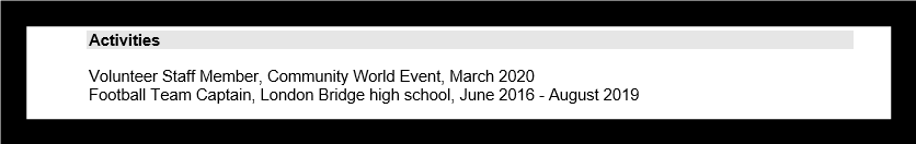 You can add this as a single section, or you can make separate sections for each heading (as shown in the example below). If you have any relevant memberships, affiliations, or have undertaken any activities that may be noteworthy in a professional capacity to the industry or role for which you are applying, by listing them in a section like this, you can significantly bolster your chances of convincing the employer you have the necessary qualities and character needed for the role. This section is a great way to convey things like leadership skills, organisational skills, and other job specific or transferrable skills and qualities that are desired or necessary for the role in question. It is also a great way to convey the overall enthusiasm and passion you have for that given field as well. For instance, if you were a team captain, if you were involved in a student body, if you performed support functions on behalf of a local sports club or other community organisation, you could note it here, (simply ensure the heading you give provides an adequate description of the function you performed – as seen in the example below)