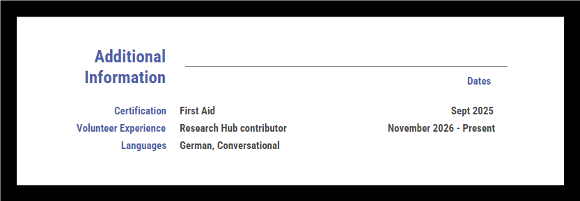 When writing an additional information section, it is normally best to include your listings by date, using a reverse chronological based order. Although a functional based order can also be used as in the example shown here, (sometimes with this format it may be less effective as the information you put into it may not all be uniform)