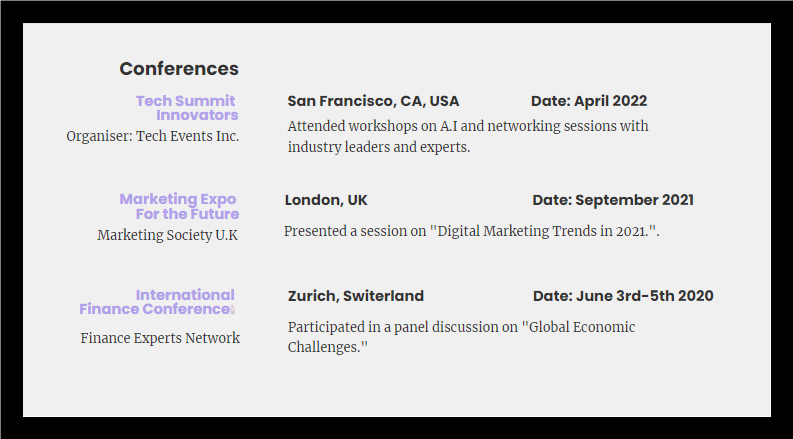 A conferences section is another optional section you can choose to include on a C.V or resume, and this can be highly impactful for certain types of roles. Again, the key factor when deciding on whether or not to include this section is relevance