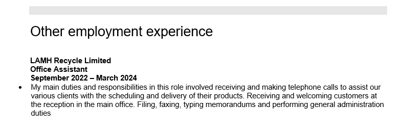 It is also acceptable to divide your employment history into relevant experience and other experience sections. As per the example above – this is referred to as a functional based employment history section, and will allow you to place additional emphasis on the most relevant parts of your employment history. This can be useful when applying for specific types of roles or industries, and can also be a very effective way to present your experience to an employer when there are long gaps in your employment history too