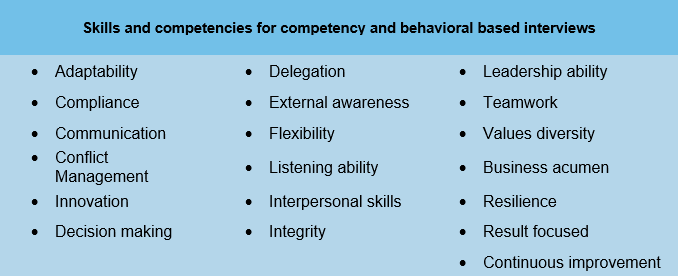 The competencies and behavioural sets looked for will vary from interview to interview, and can change based on the job role, employer, and interview type. Outside factors such as industry regulations and company/ shareholder directives may also be a factor, but the most common areas looked at will include the following