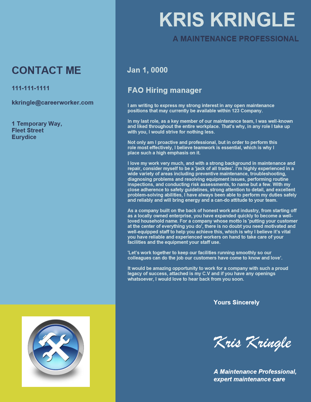 In my last role, as a key member of our maintenance team, I was well-known and liked throughout the entire workplace. That’s why, in any role I take up with you, I would strive for nothing less.