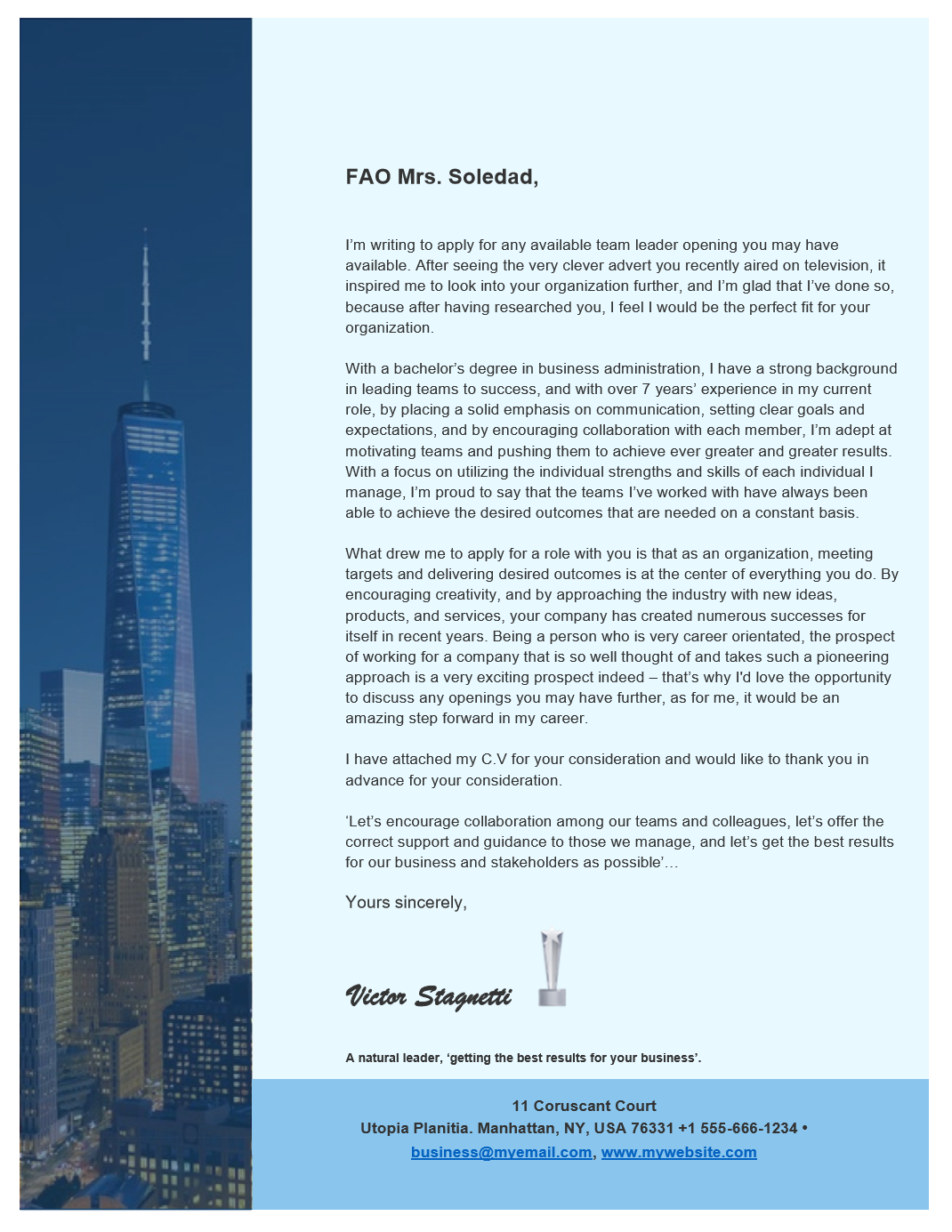 I’m writing to apply for any available team leader opening you may have available. After seeing the very clever advert you recently aired on television, it inspired me to look into your organization further, and I’m glad that I’ve done so, because after having researched you, I feel I would be the perfect fit for your organization.