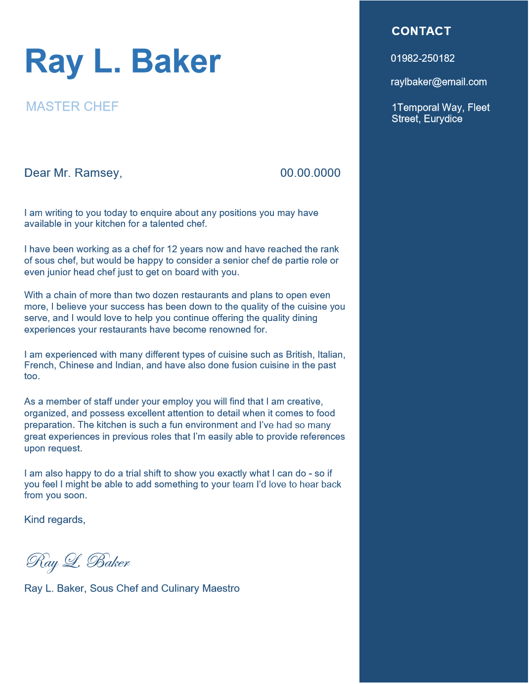 I am writing to you today to enquire about any positions you may have available in your kitchen for a talented chef