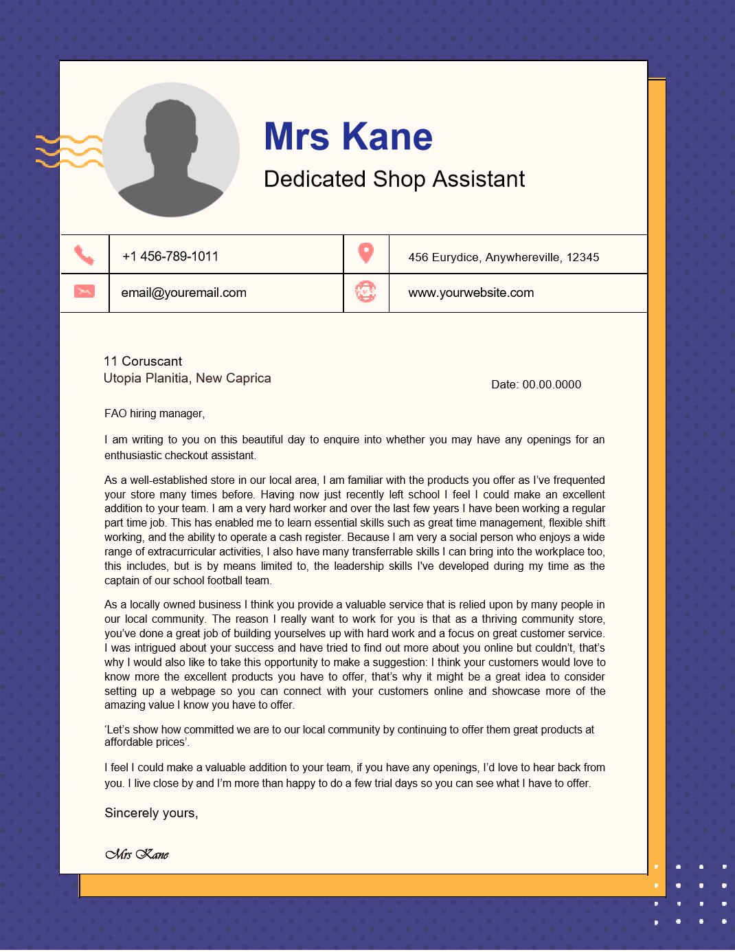 As a well-established store in our local area, I am familiar with the products you offer as I’ve frequented your store many times before. Having now just recently left school I feel I could make an excellent addition to your team. I am a very hard worker and over the last few years I have been working a regular part time job. This has enabled me to learn essential skills such as great time management, flexible shift working, and the ability to operate a cash register. Because I am very a social person who enjoys a wide range of extracurricular activities, I also have many transferrable skills I can bring into the workplace too, this includes, but is by means limited to, the leadership skills I’ve developed during my time as the captain of our school football team.