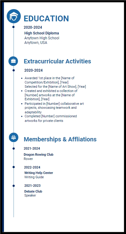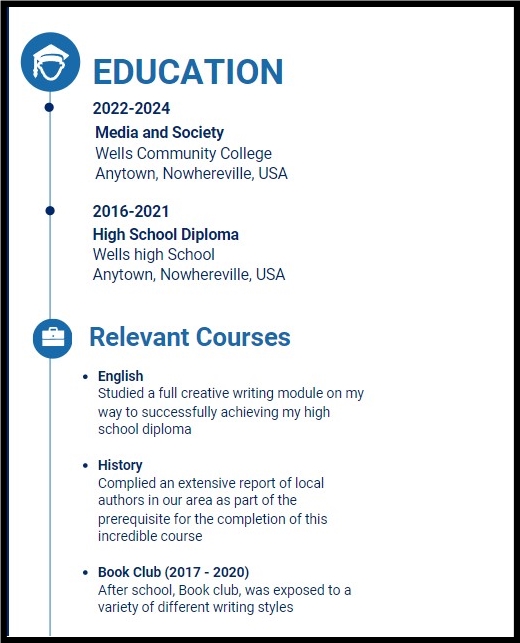 When it comes to things like relevant coursework, even if your grades have been distinctly average and you don’t feel have anything noteworthy to expand on, just remember that there are bound to have been courses you’ve taken, whether in high school or in furthering education that are sure to be relevant to the job you are applying for – that’s why highlighting these in a relevant courses subsection is typically a great practice for a student or person lacking in any solid employment experience. On top of this, almost everyone, whether in high school or in furthering education, will have participated in some form of extracurricular activity at some point in their lives, (whether it’s playing on a sports team, participating in a book club, contributing to a local journal, holding a membership, or belonging to any other type of club or society). These are all great things to add in a C.V or resume and can be included in optional sections such as Athletic or Extracurricular Achievements, Essay or Writing Competitions, and Activities, Memberships, and Professional Affiliations sections